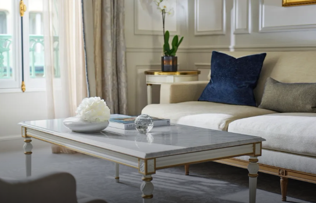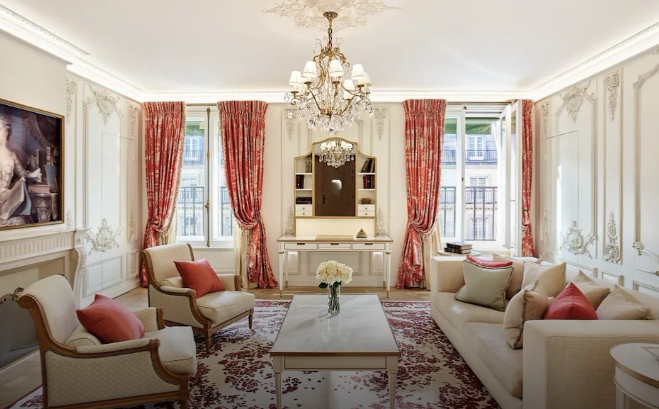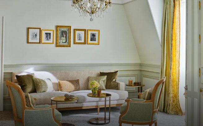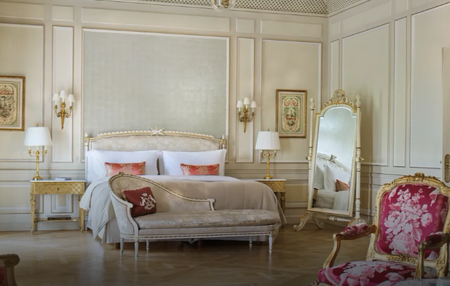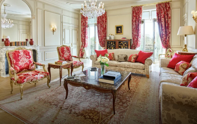 Un mobilier élégant de style Louis XV, agrémenté de luxueuses étoffes aux couleurs chatoyantes, rend hommage au savoir-faire artisanal français.